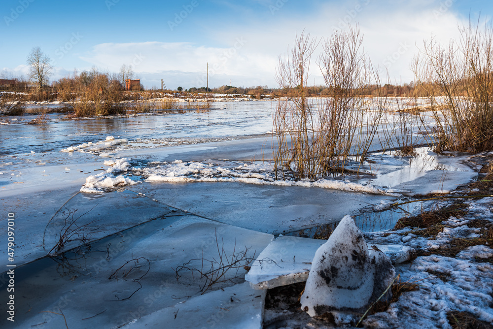 Close up view of ice drift on the frozen river. Melting ice. Stack of ice. Concept of spring floods