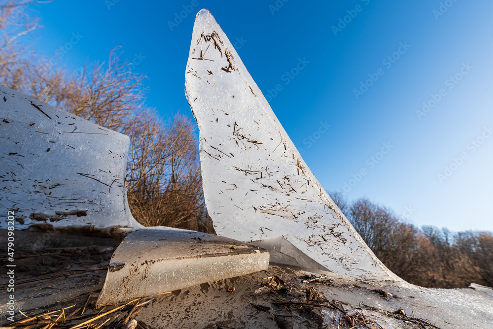 Close up view of ice drift on the frozen river. Melting ice. Stack of ice. Concept of spring floods