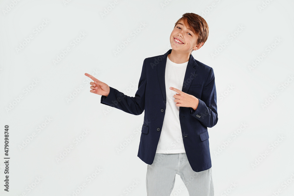 Portrait of happy smiling young boy in elegant clothes pointing on a copy space on a light grey studio background.