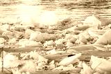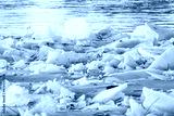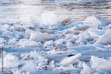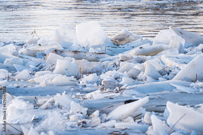 Close up view of ice drift on the frozen river. Melting ice. Stack of ice. Concept of spring floods