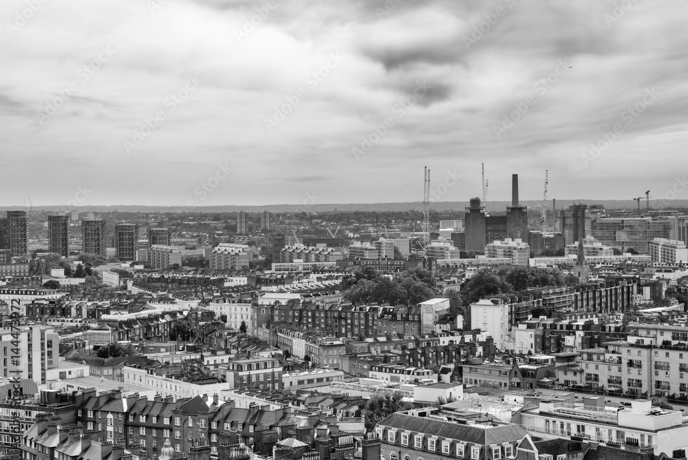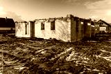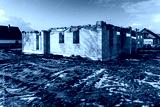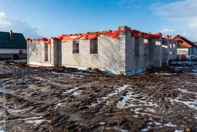 Construction of a house stopped for the winter. The top of the building covered in orange plastic sheeting. Frozen ground with shoe prints on the construction site