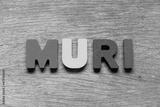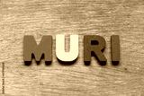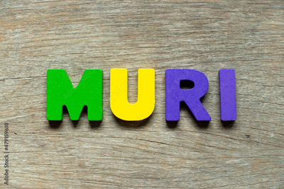 Color alphabet letter in word muri on wood background