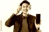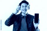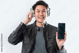 happiness asian casual mature man wear headphone music playing hand gesture hold show smartphone black screen display for your text sutdio shot white background portrait smiling asian male