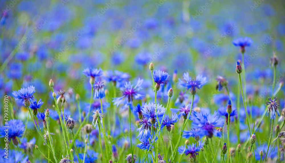 Beautiful blue corn flowers and other wild flowers in summer meadow