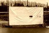 construction roadblock with scaffolding and protective netting is used for safety and to avoid dust and accidents, street art mockup for your artwork near railroad tracks.