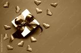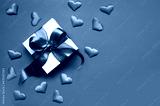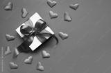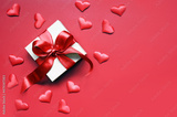 Top view photo of valentine's day decorations. White gift box and small hearts on isolated red background.