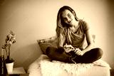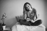 Portrait of beautiful hipster girl in headphones listening radio podcast and looking at camera resting in comfy flat, millennial user in earphones enjoying audio song during leisure entertainment