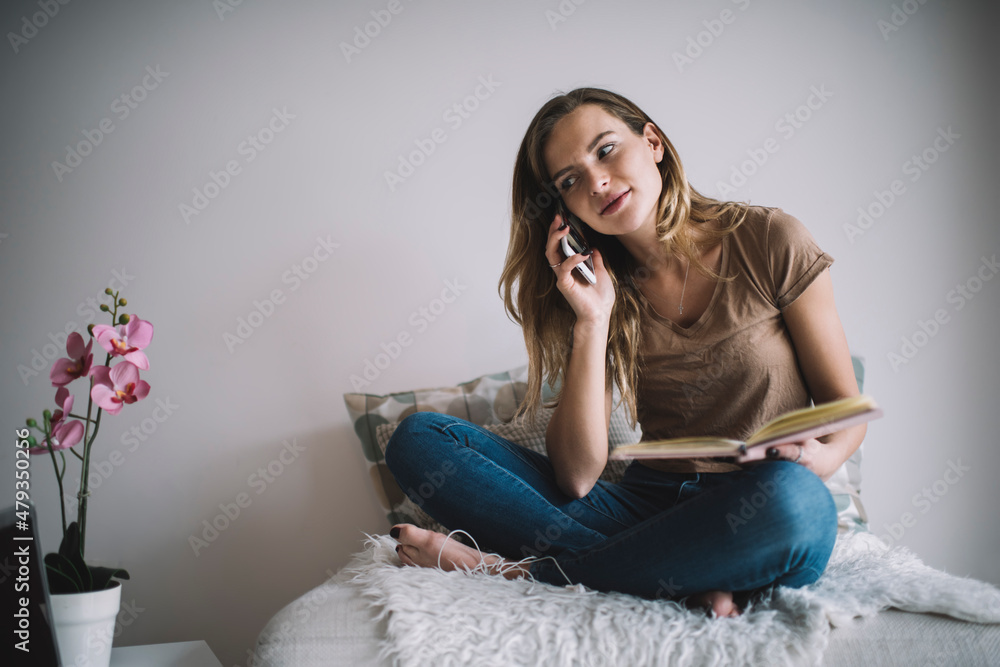 Millennial female student with personal planner calling to colleague for discussing organisation using home internet connection for phoning, Caucasian hipster girl in casual wear talking via cellular