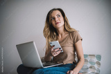 Pensive female freelancer with modern smartphone and laptop technology thoughtful looking away while feeling pondering on publication idea, skilled blogger using internet for networking in home