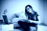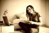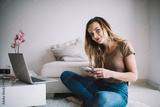 Portrait of skilled female freelancer using home internet connection for making online projecting during remote work, millennial blogger 20s with cellular technology in hand looking at camera