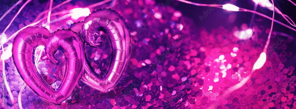 Two foil heart shaped pink and violet balloons floating against festive pink and violet background. St Valentines Day greeting card or wedding concept. minimal