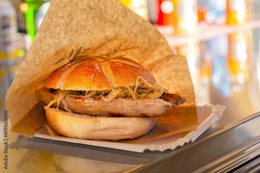 Sausage and sauerkraut sandwich. Fast food in German-speaking countries, cooked and sold by street vendors.