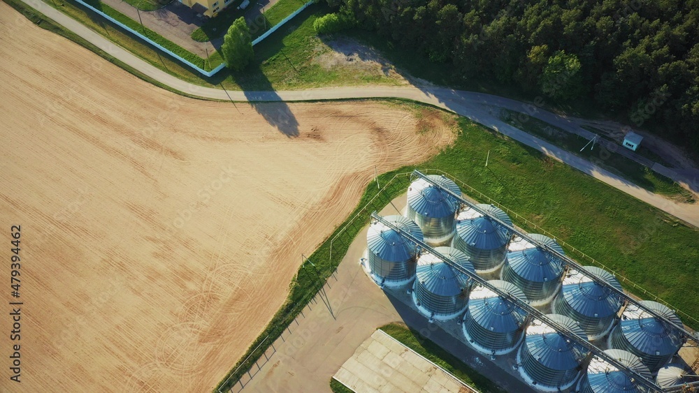 4K Aerial Elevated Top View Modern Granary, Grain-drying Complex, Commercial Grain Or Seed Silos In Sunny Spring Rural Landscape. Corn Dryer Silos, Inland Grain Terminal, Grain Elevators In A Field