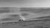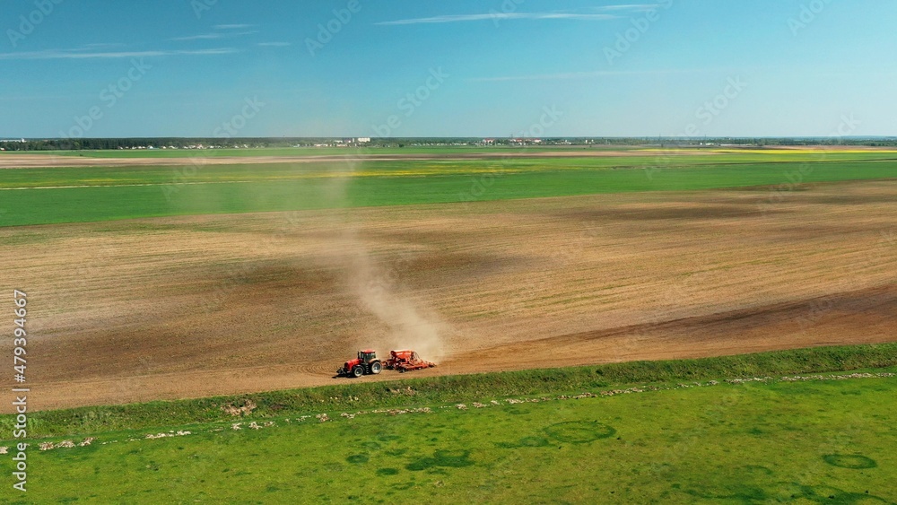 4K Aerial View Tractor With Seed Drill Machine Sowing The Seeds For Crops In Spring Season. Beginning Of Agricultural Spring Season. Countryside Rural Field Landscape. Cinematic Shot