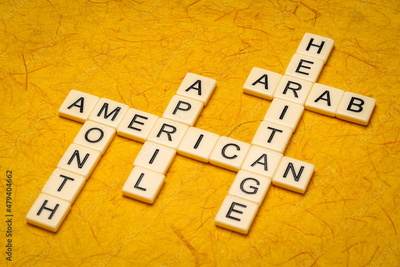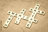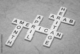 April - Arab American Heritage Month, crossword in ivory letter tiles against textured handmade paper