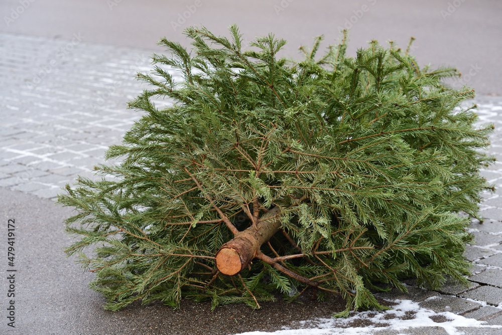 A used and discarded Christmas tree is on the street in Germany for collection in January