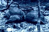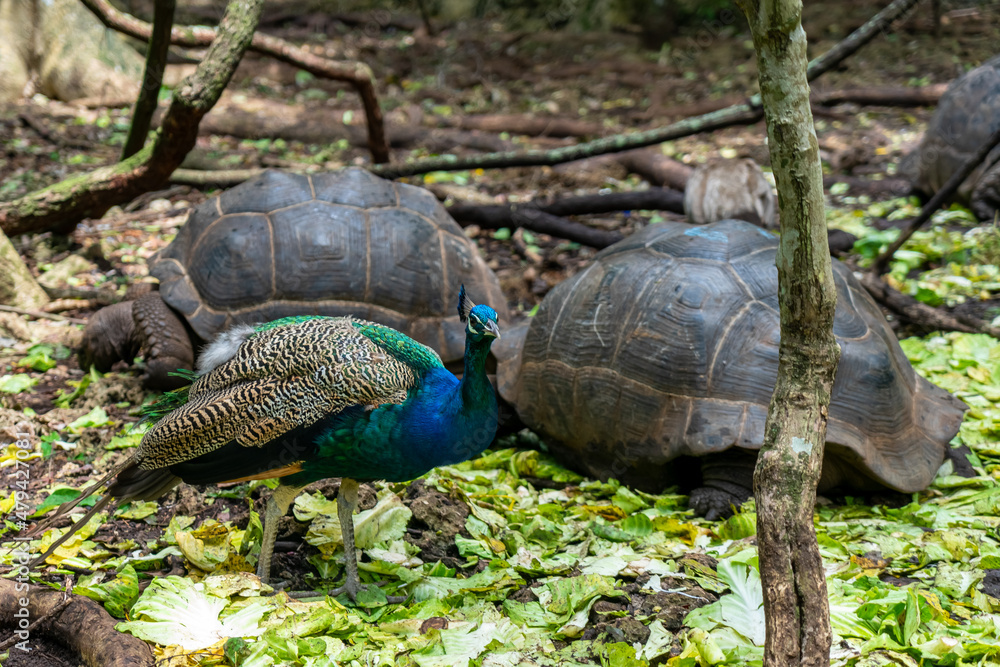 Giant Seychelles turtles and peacock in the Park on the island of Prizon, Zanzibar