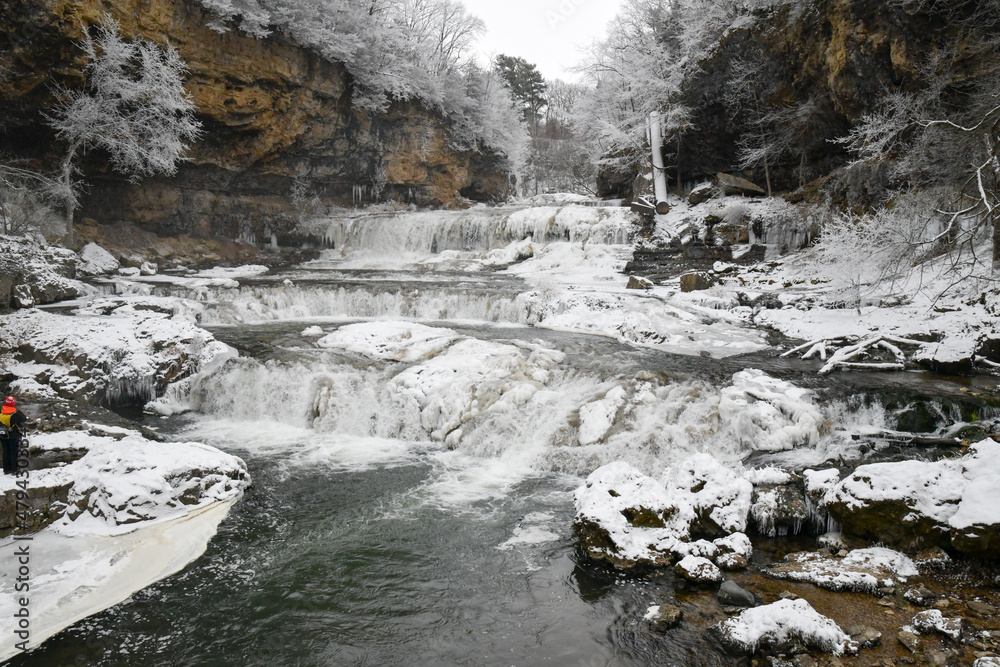 Frozen waterfall and frost in winter