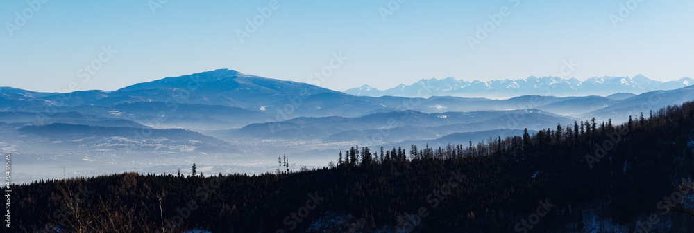 Winter view of the Slovak, Polish Tatra Mountains and Babia Gora Mountain from Beskid Slaski Mountains