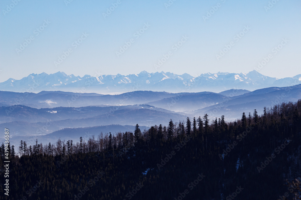 Winter view of the Slovak and Polish Tatra Mountains from Beskid Slaski Mountains