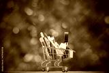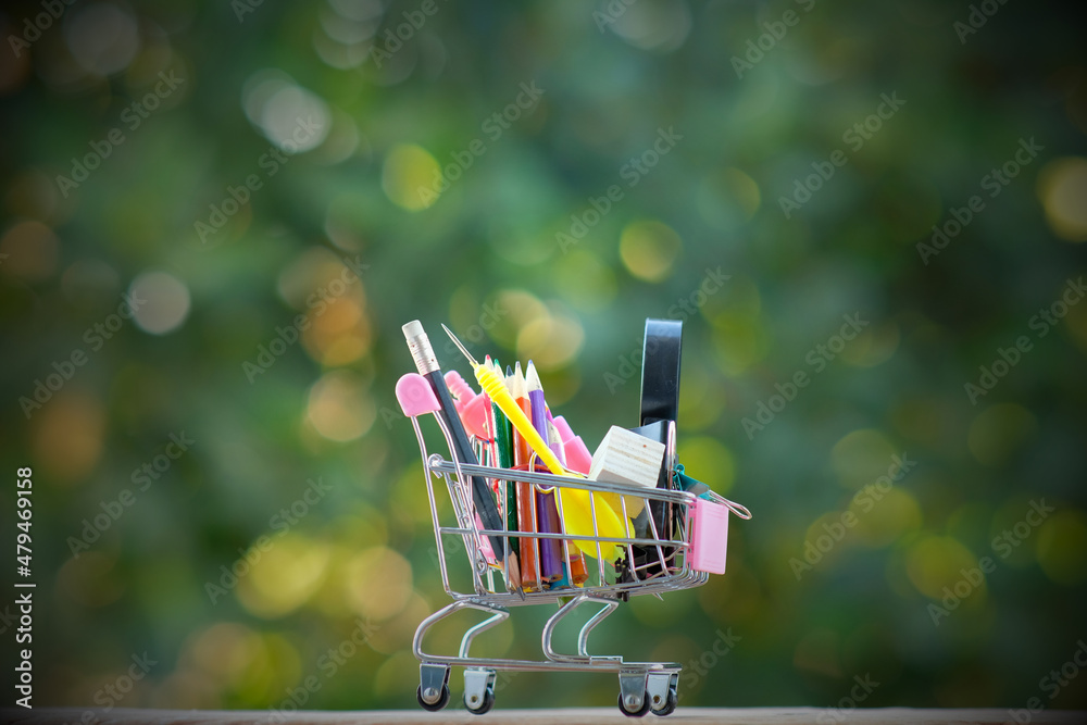 Office equipment in shopping cart and school supplies, education concept, Back to school
