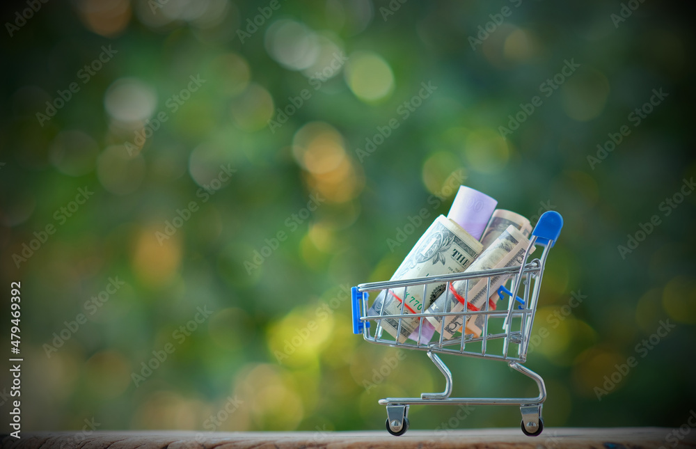 Concept of online shopping. On the table is a shopping cart with a coin.