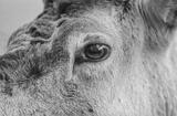 Wildlife photography. Close up detail view of the head, eyes, fur, horns of a deer stag animal in the forest.