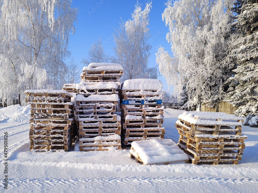 Lots of pallets. Winter landscape. Snow. Trees in the snow.
