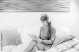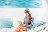 Young woman listening to music with digital tablet and relaxing while sitting on sofa