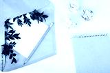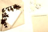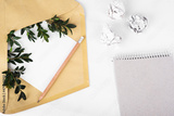 Craft paper envelope with empty paper and green twigs among crumpled paper and organic notebook