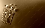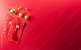 Chinese new year decorations made from red packet, orange and gold ingots or golden lump on a red background. Chinese characters FU in the article refer to fortune good luck, wealth, money flow.