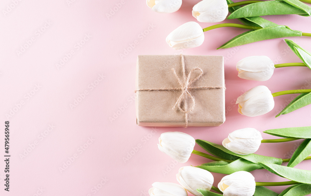 Happy women's day decoration concept, Beautiful tulips and gift box on pastel pink background.
