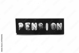 Black color banner that have embossed letter with word pension on white paper background