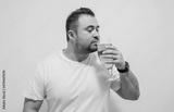 Positive bearded fat guy with a big glass of beer and smiling. Funny young man feeling happy and relaxed, with cold fresh beer in his hands after a hard day at work