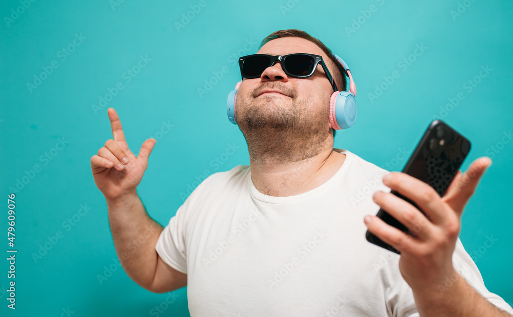 Close-up portrait of funny guy dancing and listening to music using a smartphone music application in headphones . Party man