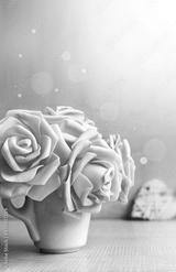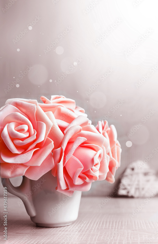 Pink roses, cup and heart on grey. Holiday concept.