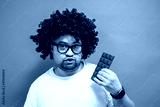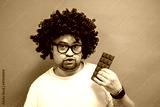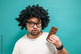 Overweight funny man in wig and eyeglasses biting large of chocolate with pleased joyful look. Glutton. Excessive sugar intake