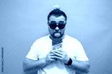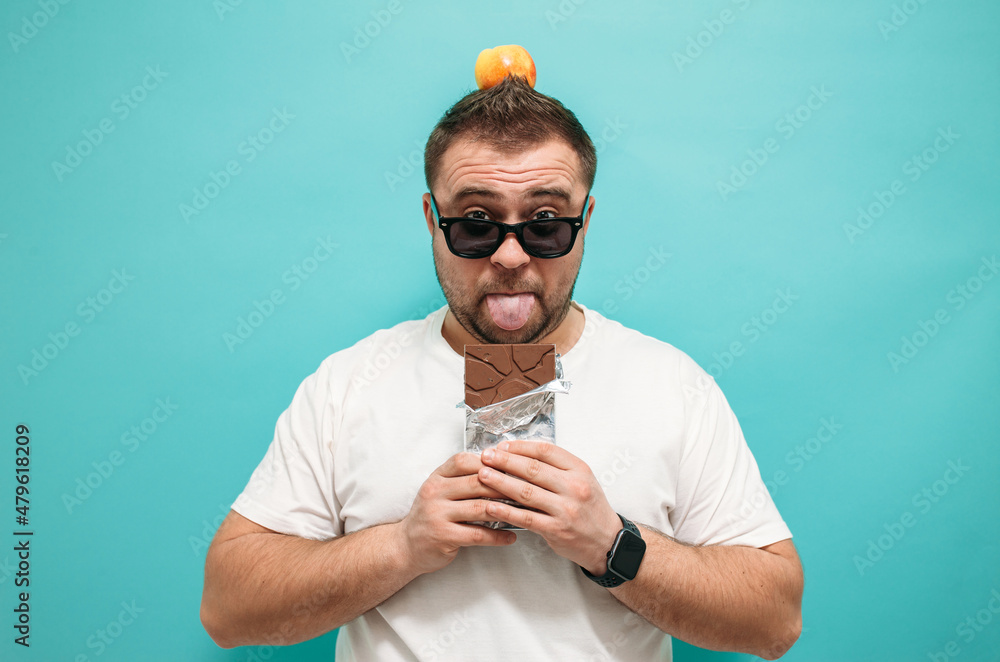 Overweight funny man biting large of chocolate with pleased joyful look. Glutton. Excessive sugar intake