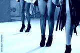 Slender female legs in fishnet stockings in black shoes in a short stage costume