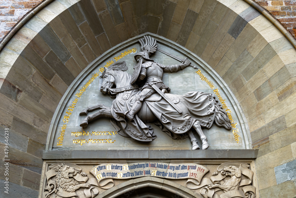 Hohenzollern Castle entrance, luxury relief with medieval knight above gate, Germany