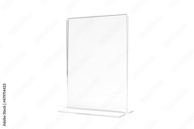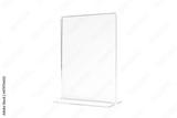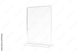 Vertical transparent desk display isolated on white background. Advertising trade stand banner. Mock Up Template. Front view. Table tent menu holder T shaped A4 or A5 format. Plastic ad plate.