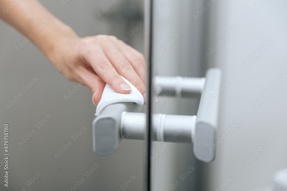 Cleaning glass door handles with an antiseptic wet wipe. Sanitize surfaces prevention in hospital and public spaces against corona virus. Woman hand using towel for cleaning home room door link.