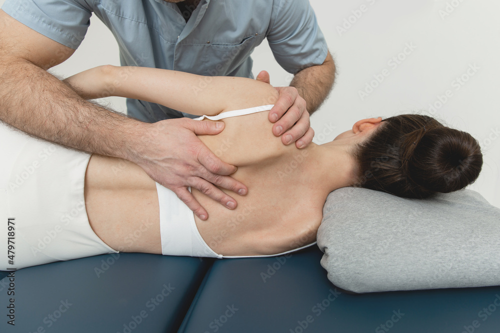 Back massage. Chiropractor or osteopath fixing back during visit in manual therapy clinic. Doctor doing shoulder blade therapy. Scoliosis. Posture Correction. Chiropractic treatment, Back pain relief.