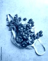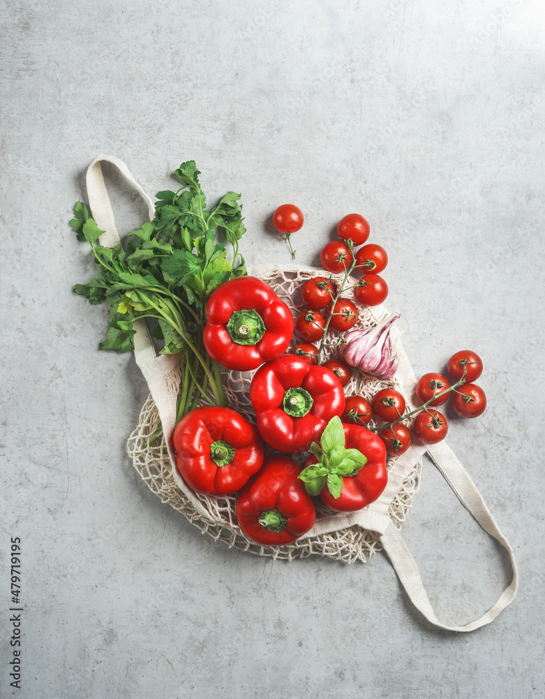 Eco-friendly shopping bag with various vegetables and herbs on gray background. Top view. Sustainable life style. No plastic. Zero waste concept.
