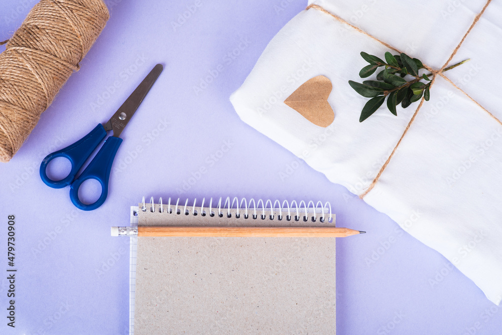 gift in eco package and green twigs from above notebook with pen and bundle winding and scissors among on very peri back