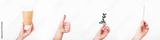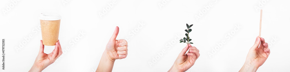 collage of paper coffee cup, sign of approval by hand, wooden stick and green twig on white background. zero waste