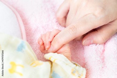 お母さんの手をギュっと握る新生児の写真。赤ちゃん・子育てのイメージ。