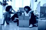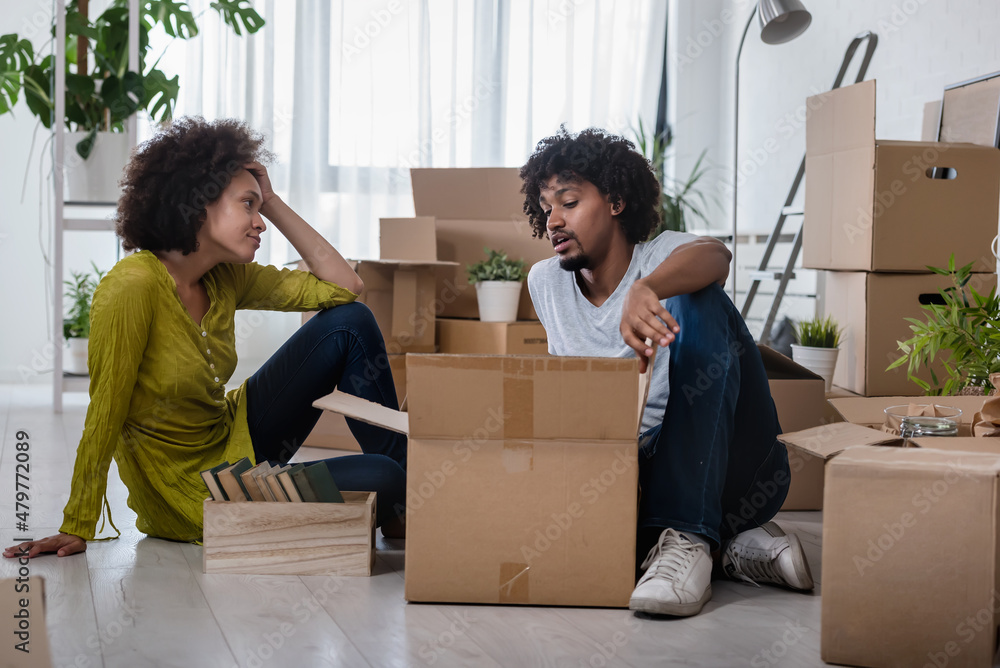 Happy playful African American couple moving in a new apartment, unpacking, moving stuff, purchase and rent property, investment concept