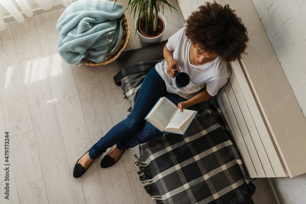 Beautiful African-American young Woman reading a book at home. Cozy corner. Education. Daydreaming and passion concept