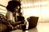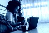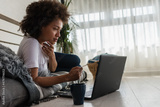 Beautiful African-American young Woman purchasing online with a credit card using a laptop computer at home